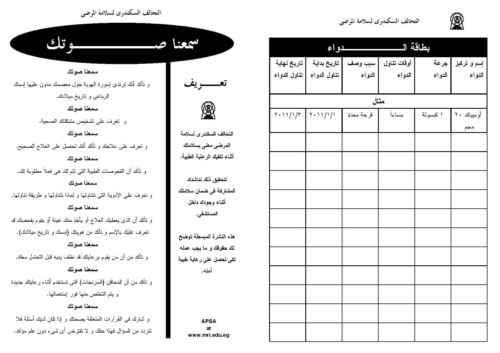 You can download the APSA patient involvement leaflets (سمعنا صوتك) that inform patients on how they could engage with their healthcare team in guaranteeing their own safety during hospital stay. Patient safety leaflet version 2 has been designed in black and white so it can be easily printed, photocopied, and folded on itself for immediate use. On its back side, a medication chart is provided that can help patients track their medication schedule.