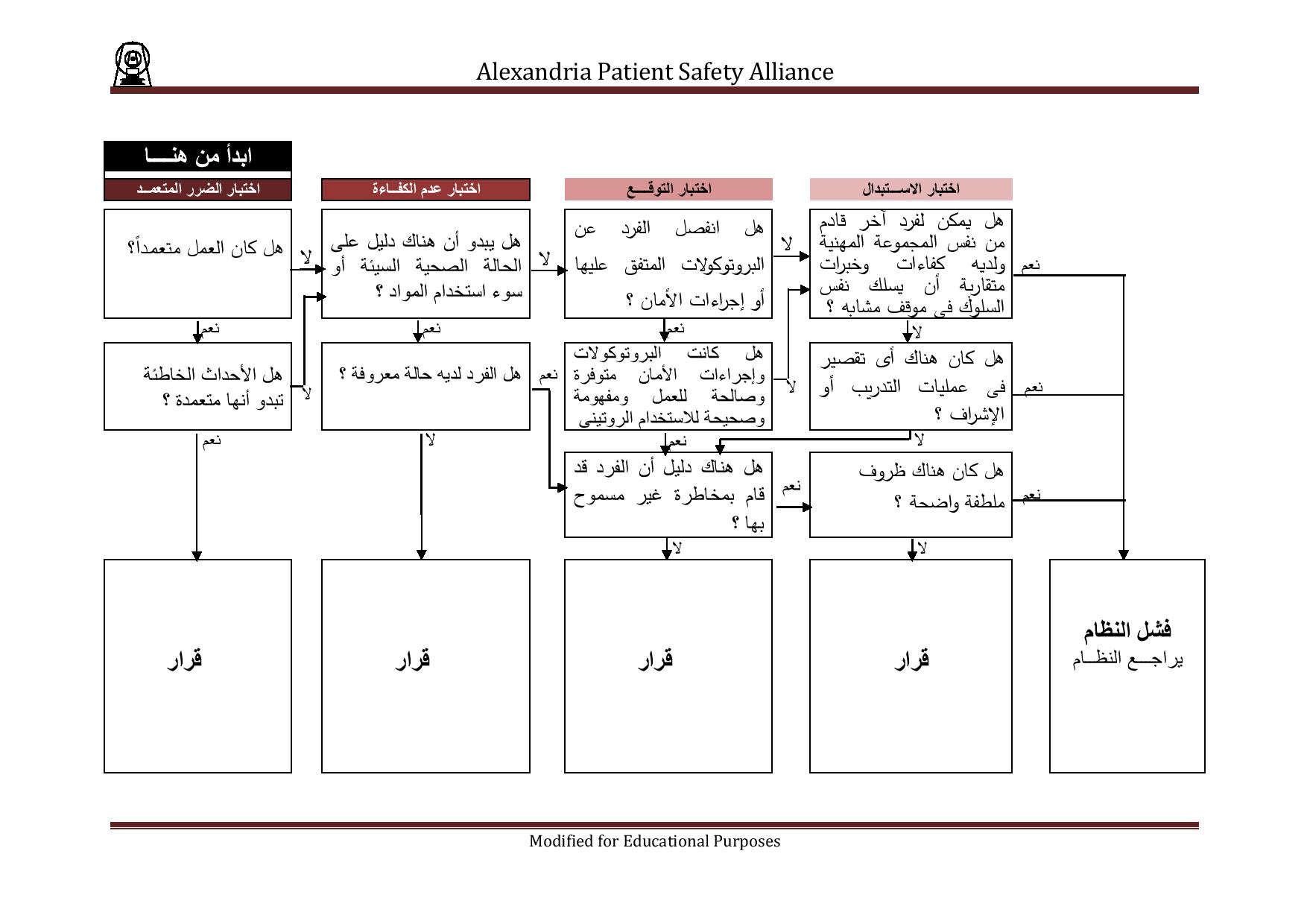 The Incident Decision Tree (National Patient Safety Agency, UK) is designed to help managers decide initial action to take with staff involved in patient safety incidents. The tool is based on a flowchart which guides the use through a series of structured questions about the individual’s action, motives and behviour at the time of the incident. The responses to these questions lead to suggestions for appropriate management action. The Incident Decision Tree has been simplified and translated into Arabic by APSA for educational and local adaptation purposes.