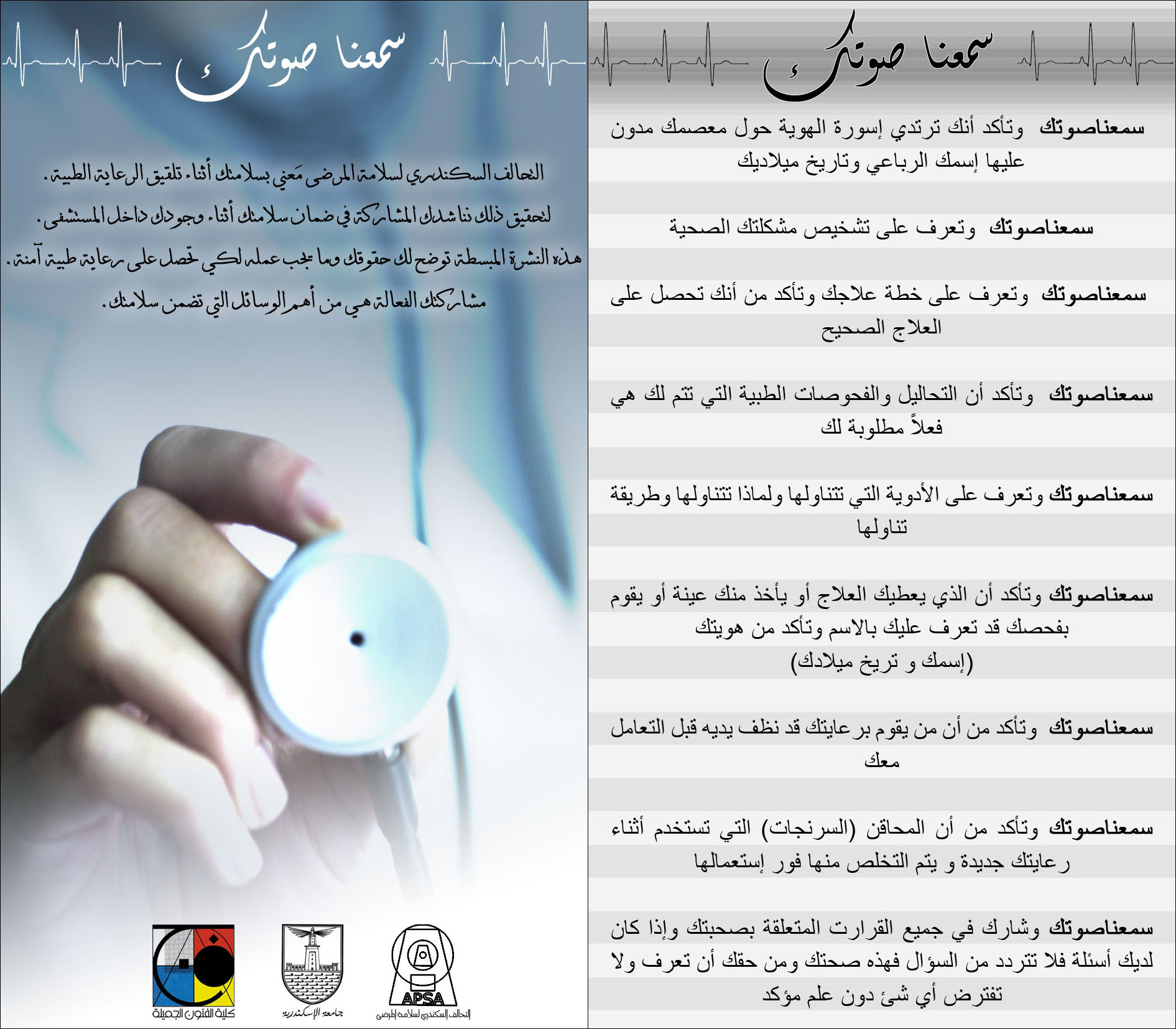 You can download the APSA patient involvement leaflets (سمعنا صوتك) that inform patients on how they could engage with their healthcare team in guaranteeing their own safety during hospital stay. Patient safety leaflet version 2 has been designed in black and white so it can be easily printed, photocopied, and folded on itself for immediate use. On its back side, a medication chart is provided that can help patients track their medication schedule.